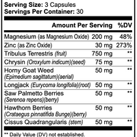Ingredients: Magnesium (as Magnesium Oxide) 200mg, Zinc (as Zinc Oxide) 30mg, Tribulus Terrestris (fruit) 750mg, Chrysin (seed) 75mg, Horny Goat Weed (aerial) 50mg, Longjack (root) 50mg, Saw palmetto Berries 50mg, Hawthorn Berries 50mg, Cissus Quadrangularis (stem) 50mg, Cellulose (vegetable capsule), Rice Flour, Magnesium Stearate.