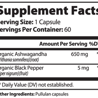 Ingredients: Organic Ashwagandha (Withania somnifera)(root), Organic Black Pepper (Piper nigrum)(fruit), pullulan capsules.